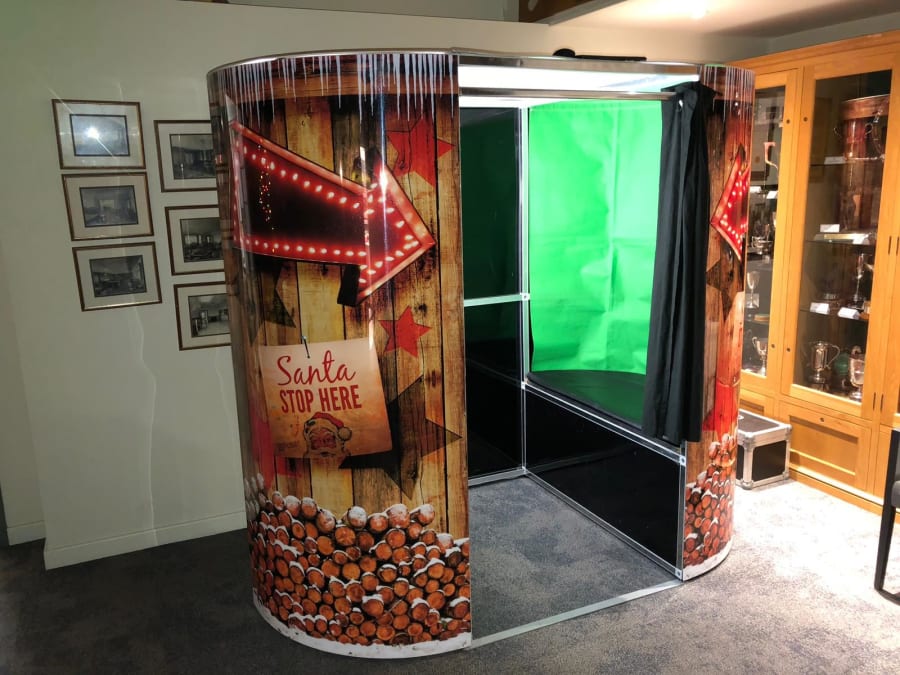 Our Christmas Photo booth has its very own Christmas Log cabin outer skin to match perfectly to your themed Christmas event. Choose from standard red curtain or fixed green screen Christmas images.