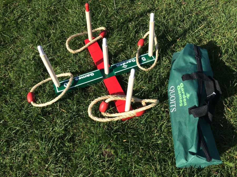 A classic, traditional game, requiring skill and accuracy, where all the family can compete on equal terms. Contains 5 hardwood screw in pegs , 4 real rope quoits. A superb low cost, fun game packed in a green canvas bag.