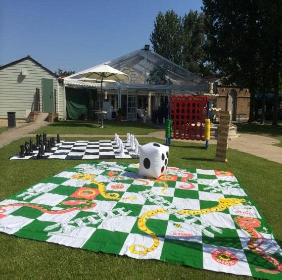 The classic game but giant in size. This playing surface measures a whopping 3 metres by 3 metres and players use themselves as markers and the 2 inflatable dice to play the game. PVC mat comes with pegs to secure to ground when playing outside. Suitable for both indoor and outdoor use.