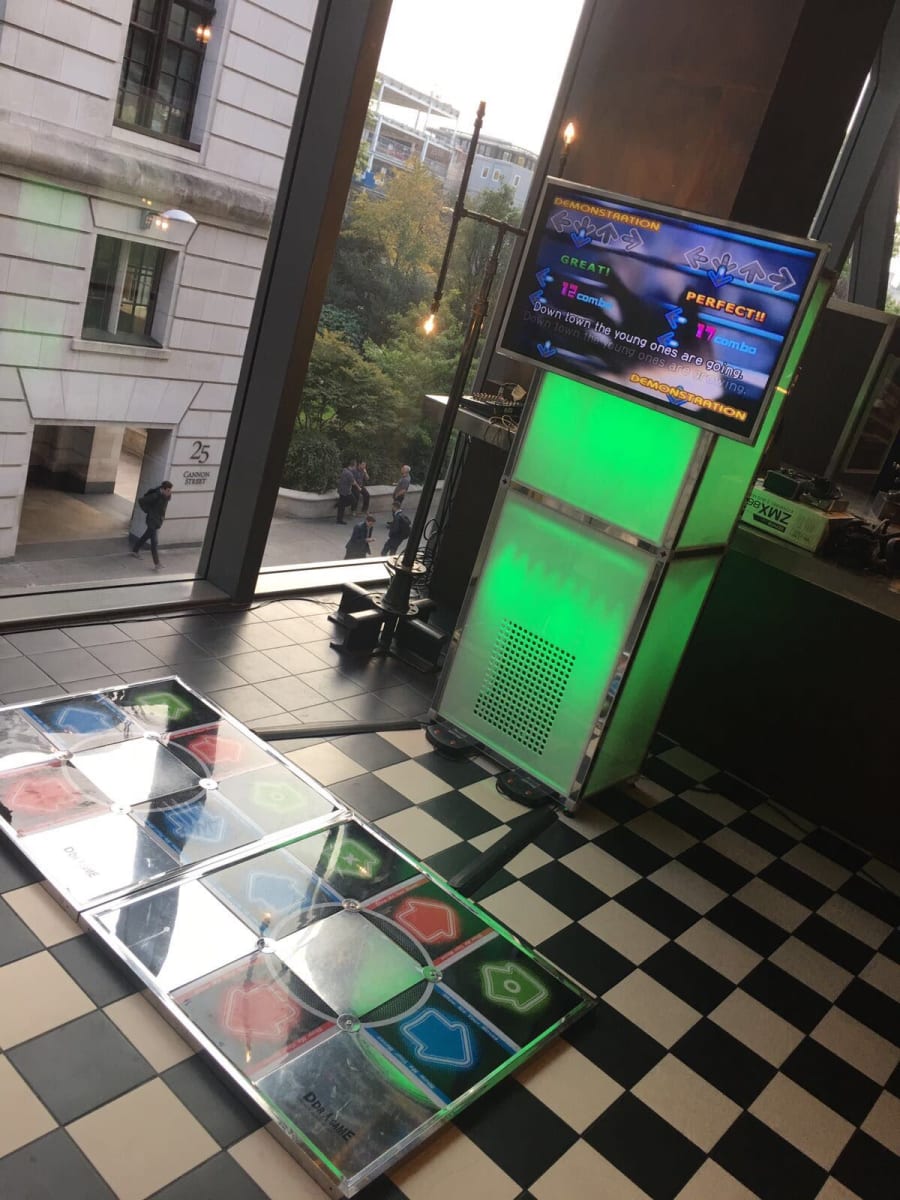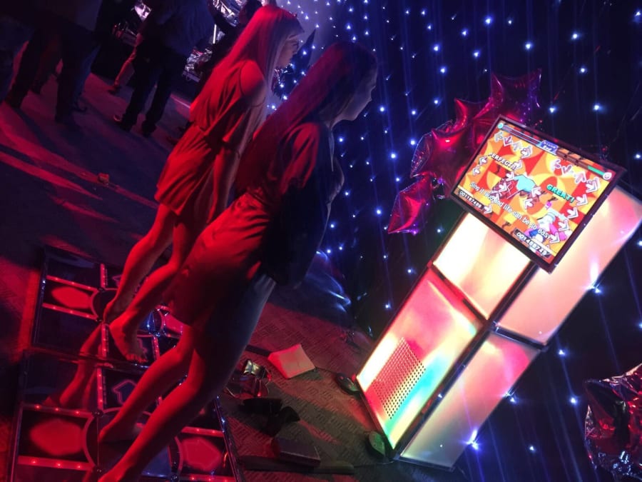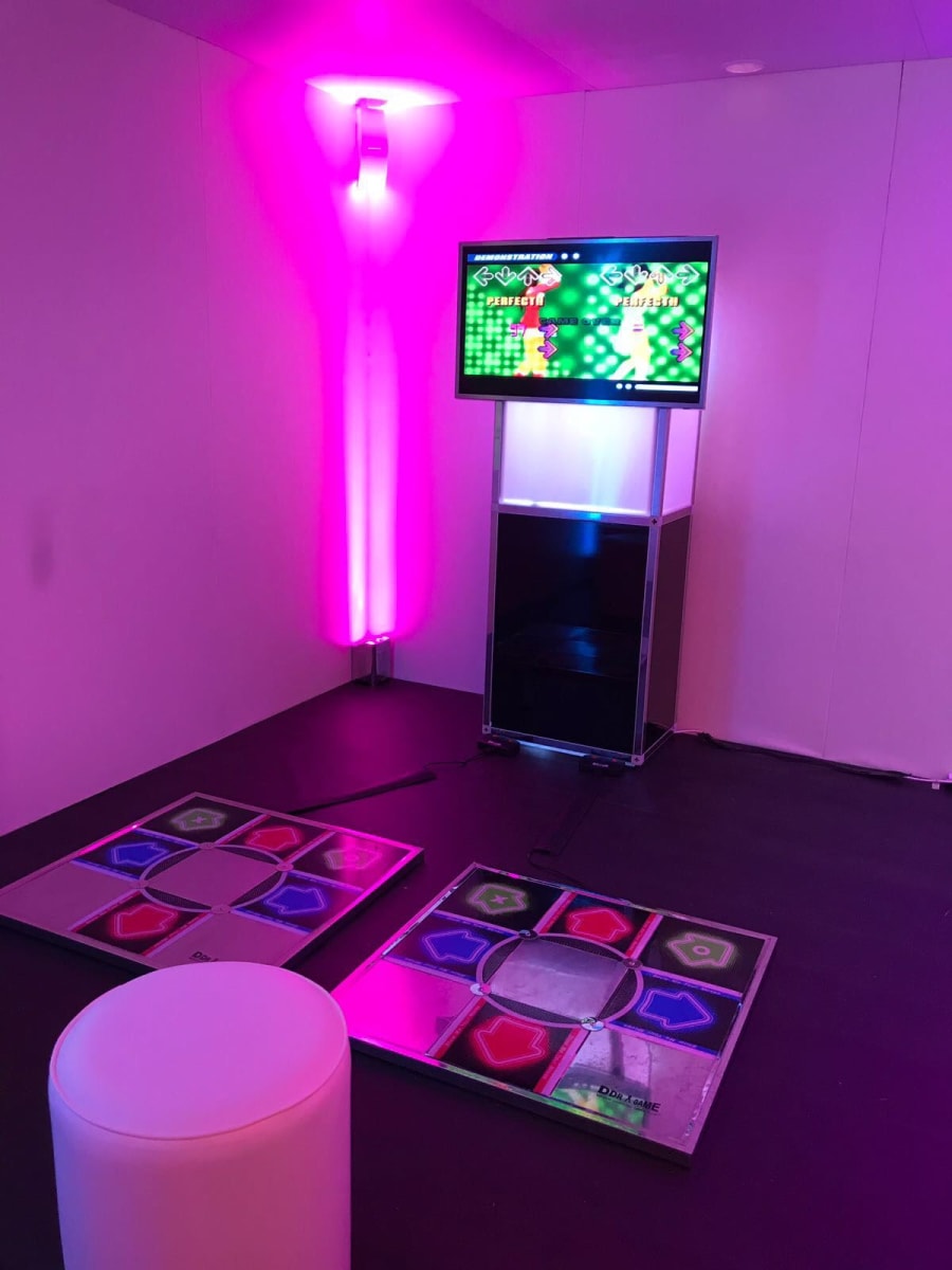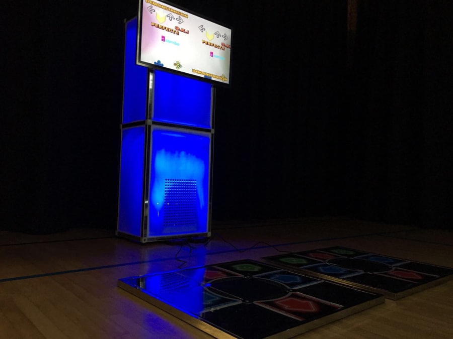 Our dance machine hire is supplied and installed complete with twin authentic arcade style dance mats, HD display in an authentic arcade style stand, powered pa system and ultra bright colour change LED lighting.