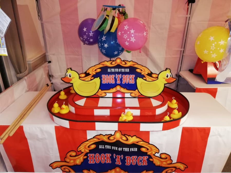 Traditional side stall in red and white colours with our very own Hook a Duck Game.