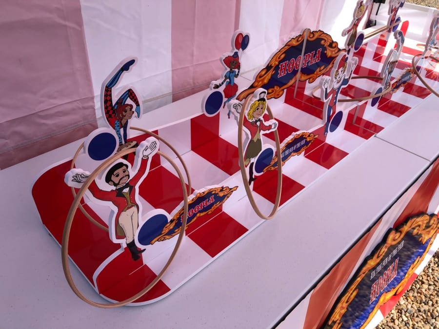 Traditional side stall in red and white colours with our very own Hoopla Game. Completely unique with manufactured circus characters to throw the hoops over.