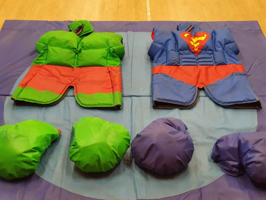 Each hire contains 2 adult sumo suits in a Super Hero theme & 1 x safety mat in the style of a sumo ring.